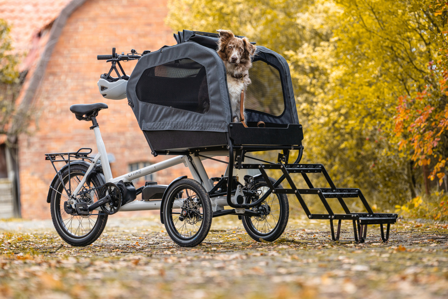 Mit einer Länge von unter 2 m und einer Breite von nur 73 cm passt CHIKE auch über schmale Fahrradwege und durch alle gängigen Türen, bietet aber durch seine innovative Konstruktion dennoch sehr viel Platz für alles, was man transportieren möchte. Das gefederte Neigefahrwerk macht CHIKE dabei extrem sicher, komfortabel und wendig.“