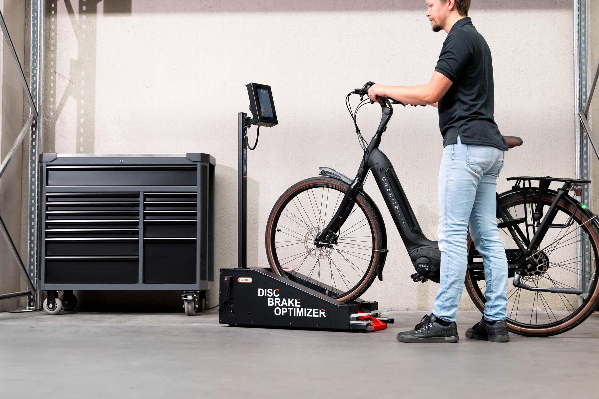 Maximale Bremsleistung beginnt nicht auf der Straße - sondern in der Werkstatt.Jeder, der regelmäßig mit modernen Scheibenbremsen arbeitet, weiß: optimale Leistung erfordert mehr als nur eine gute Montage. Das Geheimnis liegt im Detail - und Elvedes hat diese Details sorgfältig untersucht. Das Ergebnis? Eine innovative Maschine, die das Einbremsprozess vollständig perfektioniert und vereinfachtWarum einbremsen so wichtig istScheibenbremsen funktionieren nur dann optimal, wenn der Kontakt zwischen Belägen und Bremsscheibe voll ausgenutzt wird. Unter unserem Super-Mikroskop betrachtet, sind neue Bremsbeläge und -scheiben alles andere als flach: eine Landschaft aus Höhen und Tiefen. Beim Einbremsen wird das Reibmaterial des Belags in die Poren der Bremsscheibe gerieben, so dass eine homogene Kontaktfläche entsteht. Erst dann ist die Bremse bereit, ihr volles Potenzial zu erreichen.Das Einbremsen ist also unerlässlich, wird aber in der Praxis noch zu oft unterschätzt oder falsch durchgeführt. Und genau hier setzt Elvedes mit einer professionellen, reproduzierbaren Lösung an.Der Elvedes Disc Brake Optimizer: Kontrolle und Gefühl in einem ArbeitsgangAnstatt die Scheibenbremsen auf dem Weg einzubremsen, bietet Elvedes jetzt eine Maschine an, die den Prozess leitet und vereinfacht. Der Disc Brake Optimizer wurde speziell für Werkstätten entwickelt, die Qualität und beste Leistung garantieren wollen - immer und immer wieder.Was sofort auffällt, ist das gut durchdachte Design. Eine integrierte Rampe und Räder ermöglichen ein einfaches Verschieben der Maschine. Außerdem eine verstellbare Digitalanzeige mit Touchscreen in Augenhöhe, die den Mechaniker Schritt für Schritt durch das Programm führt. Radgröße, Bremsbelagmischung - alles ist leicht einzustellen. Die Maschine leitet dann den gesamten Einbremsvorgang, wobei der Mechaniker selbst eine wichtige Rolle spielt.Während des Bremsvorgangs muss der Mechaniker die Bremse manuell genau zu den Zeiten betätigen, die das Display anzeigt. Auf dem Bildschirm erscheint dann ein Balken, der in Echtzeit anzeigt, wie viel Kraft auf den Bremshebel ausgeübt werden muss. Diese Anzeige ist mit dem Widerstand verknüpft, der während des Bremsvorgangs in der Maschine entsteht. So erhält der Mechaniker eine sofortige Rückmeldung, und jede Bremsbewegung wird genau auf das ideale Einbremsprofil für die gewählte Bremsbelagmischung abgestimmt.Gebaut für die WerkstattpraxisDer Elvedes Disc Brake Optimizer ist für alle gängigen Radgrößen und Reifenbreiten geeignet. Er ist robust gebaut und für den intensiven Einsatz konzipiert. Ob Rennräder, Mountainbikes, Fatbikes oder E-Bikes: Jedes Fahrrad kann sicher und schnell mit einer optimal gebremsten Bremsanlage ausgestattet werden.Das Ergebnis: Bremsen wie es sein sollNach Einbremsen mit dem Elvedes Disc Brake Optimizer ist das Bremssystem sofort einsatzbereit. Keine quietschenden Bremsen und Leistungsabfall bei den ersten Fahrten, der Kunde fährt mit der Gewissheit los, dass die Bremsanlage genau das tut, was sie tun soll - vom ersten Meter an.Kurzum: Der Elvedes Disc Brake Optimizer ist kein Luxus, sondern ein logischer Schritt für Werkstätten, die nach den besten Ergebnissen streben.