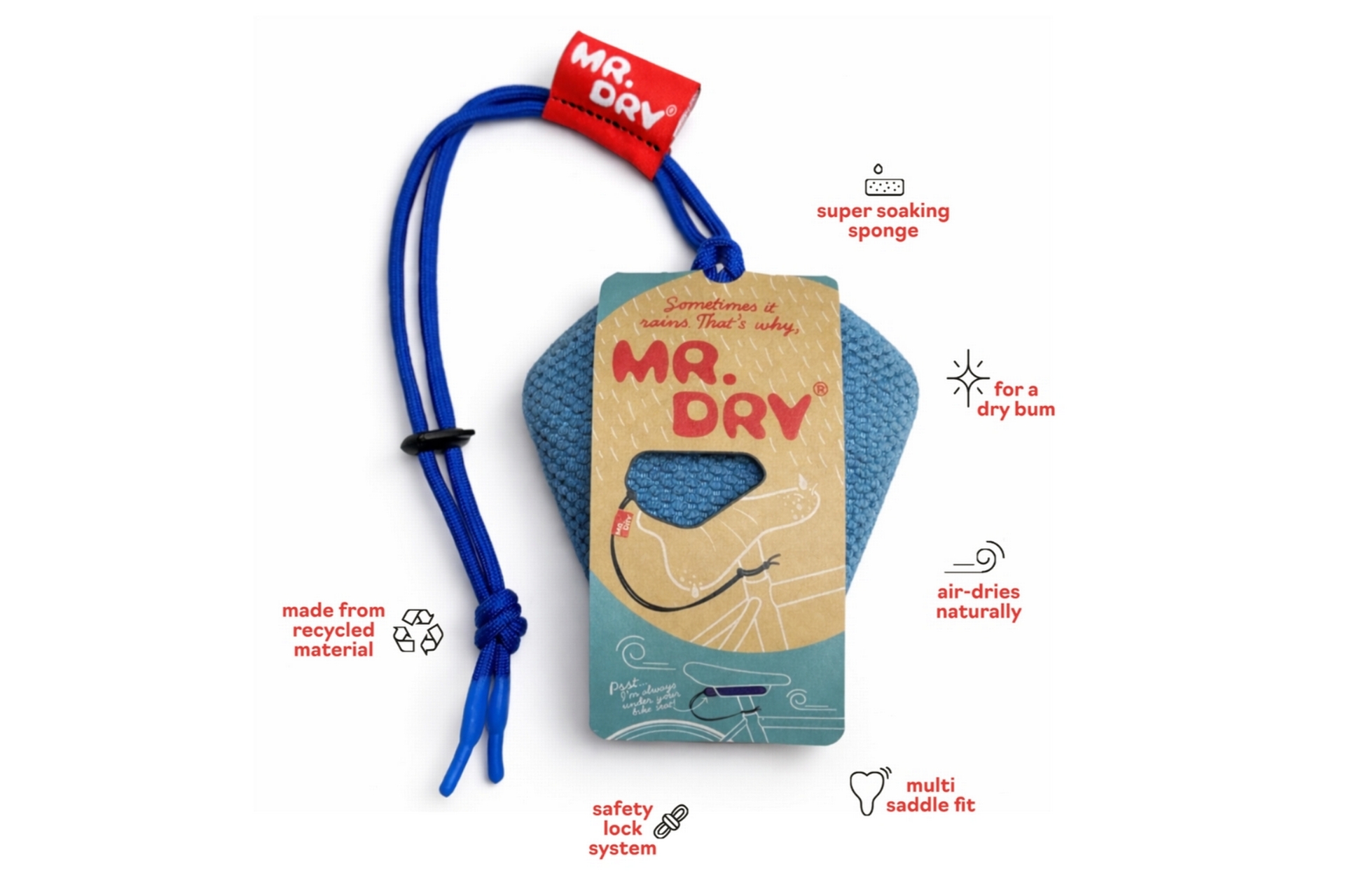 MR. DRY ist die wiederverwendbare Lösung für einen trockenen und sauberen Fahrradsattel. Er nimmt Feuchtigkeit und Schmutz schnell auf und sorgt so für eine komfortable Fahrt — inspiriert von unberechenbaren niederländischen Wetter. Nach der Nutzung wird MR. DRY einfach unter dem Sattel verstaut, wo er während der Fahrt durch den natürlichen Luftstrom trocknet.